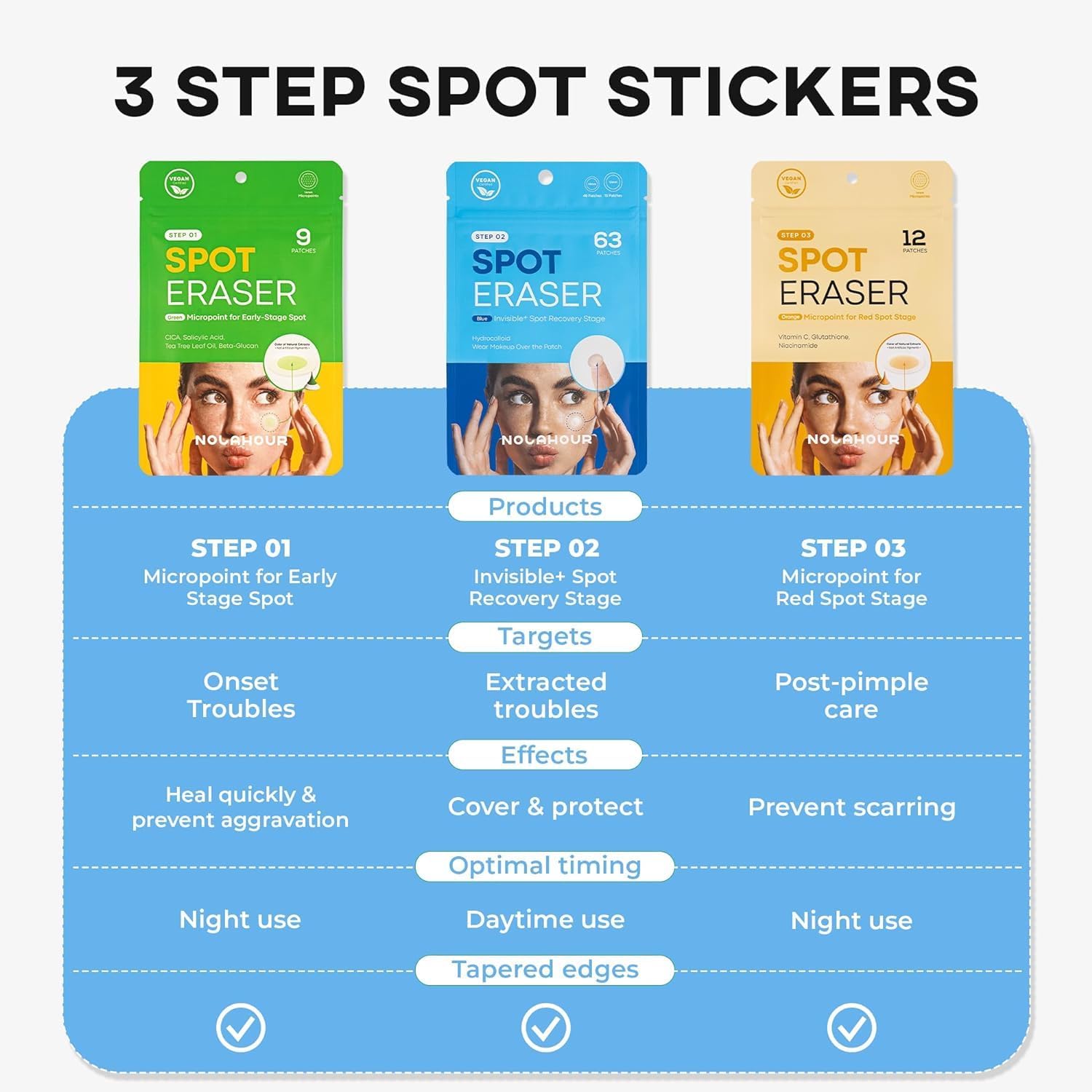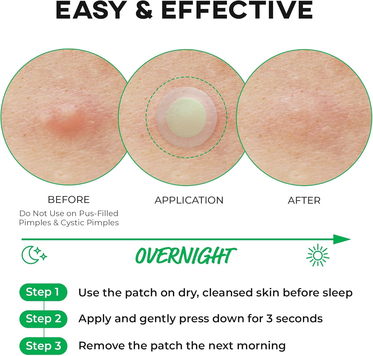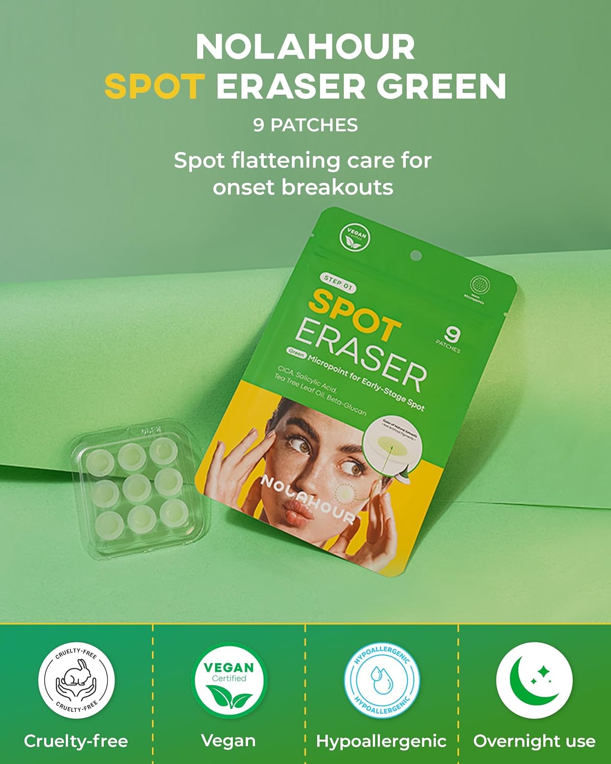 الحل الشامل للبقع المزعجة. بفضل قوة نبات سنتيلا آسياتيكا، وأوراق شجرة الشاي، وحمض الساليسيليك، وبيتا جلوكان، تعمل هذه اللاصقات طوال الليل على إزالة البقع المبكرة ومنح بشرة أكثر صفاءً مع حلول الصباح.